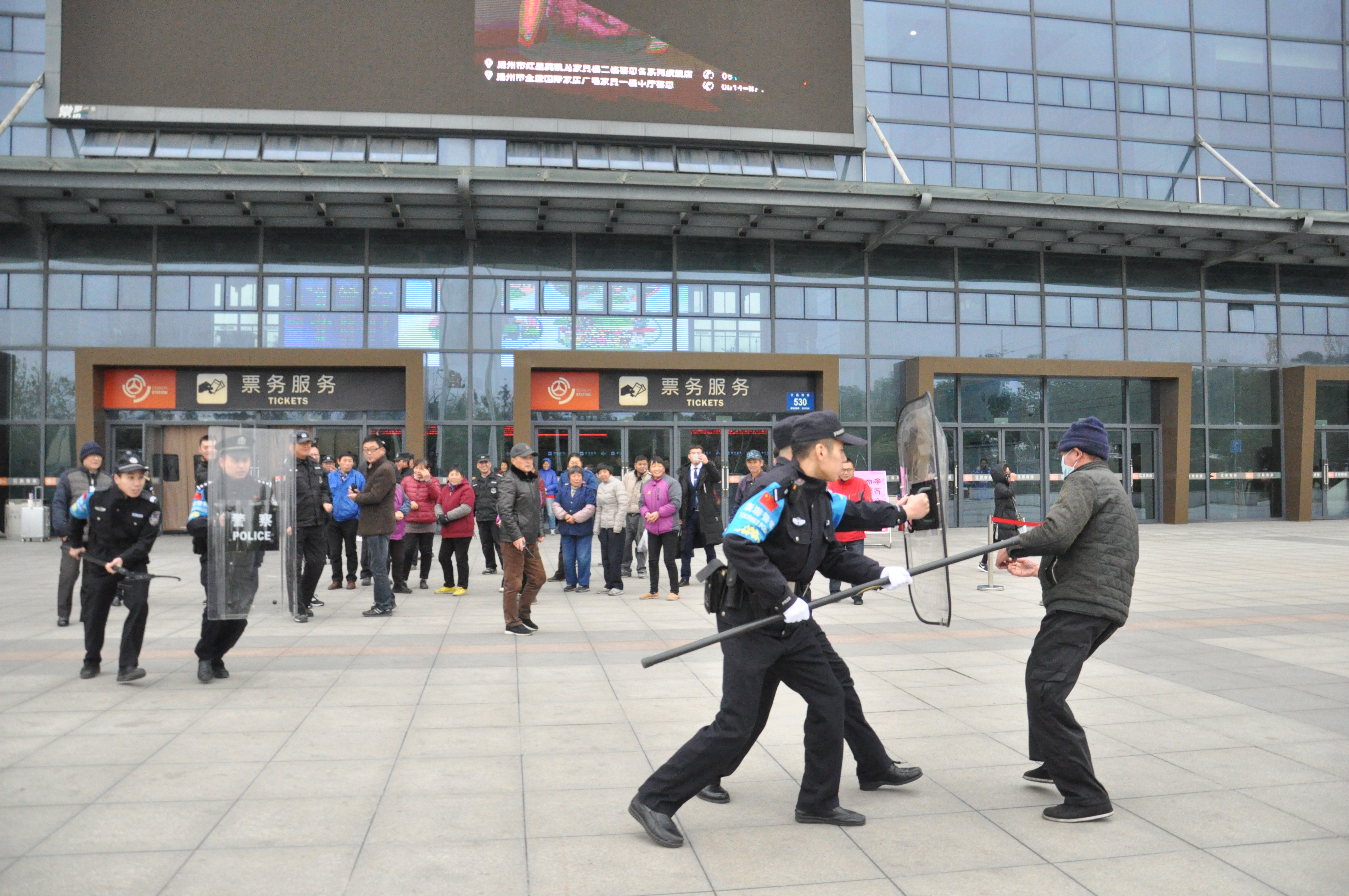 為有效防范公共場所可能發生的暴力恐怖事件,加強車站工作人員安全防范意識,提高對突發事件的應急處置能力,12月7日下午,揚州站聯合揚州市公安局公交治安分局汽車總站派出所,在站前廣場開展年度反恐防暴演練。