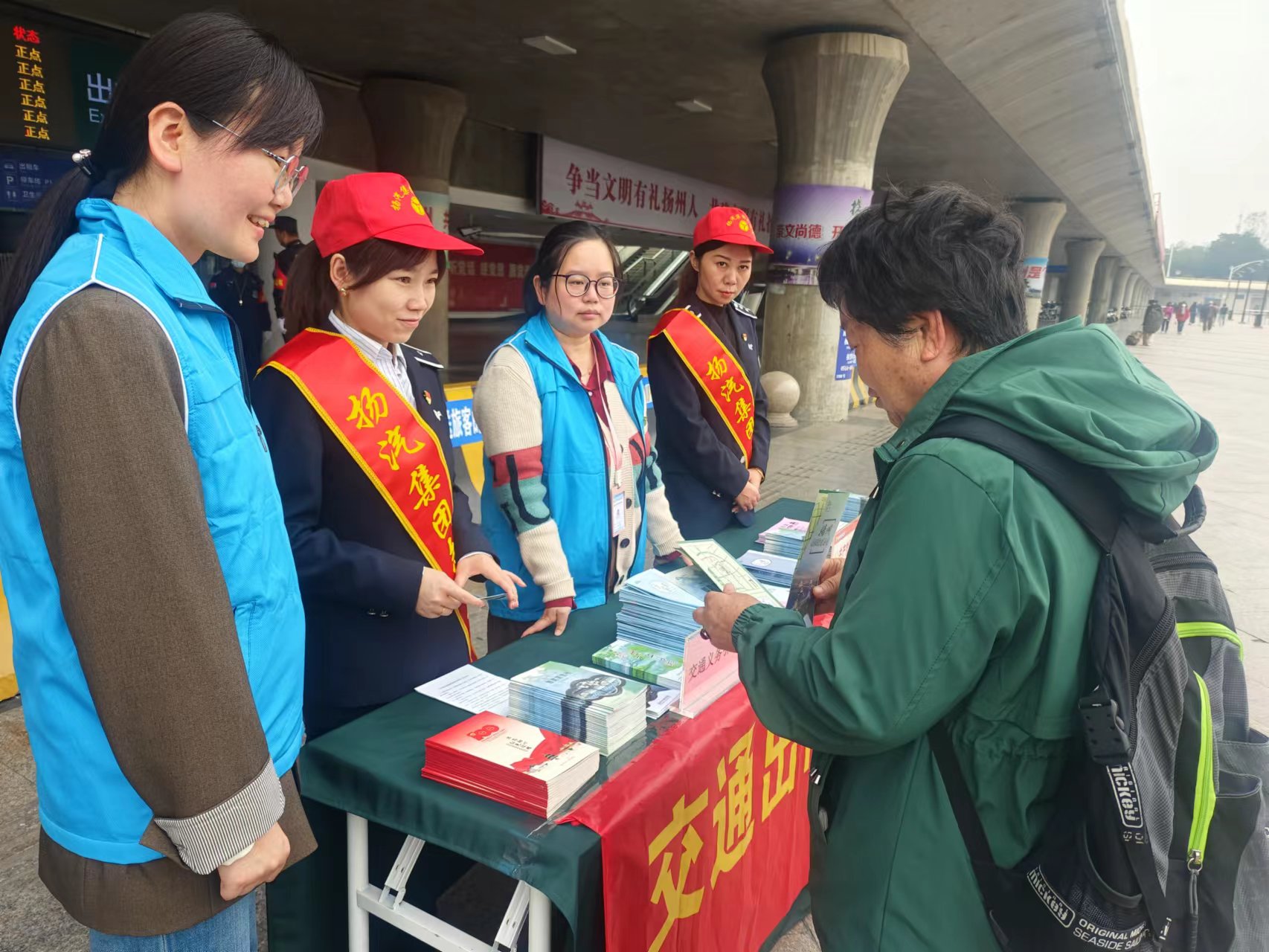 活動現場,志愿者們有序為旅客提供問詢指引、維持秩序、文明勸導等志愿服務,熱情為旅客們介紹揚州的美景、美食以及旅游線路的規劃,用熱情的服務態度和專業知識,給旅客們帶來了更好地幫助。